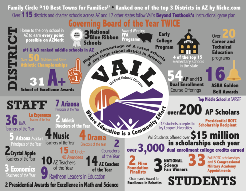 The award winning Vail School District continues to serve as a lighthouse district! The hard work of staff, students, parents, and the community continues to earn the District numerous accolades. Those accolades are a reflection of the District's mission statement being fully realized - "It is the mission of the Vail School District to provide parents with safe and nurturing school communities where their children can obtain a quality education."